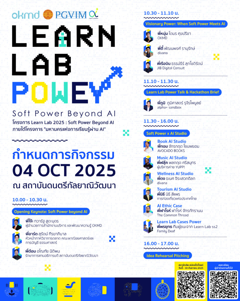 พบกับกิจกรรมสุดเข้มข้น เริ่มตั้งแต่ “Visionary Power: Soft Power Meets AI” เสวนาแลกเปลี่ยนมุมมองเมื่อ AI, Soft Power และ Startup มาเจอกันจะเป็นอย่างไร? ![]()