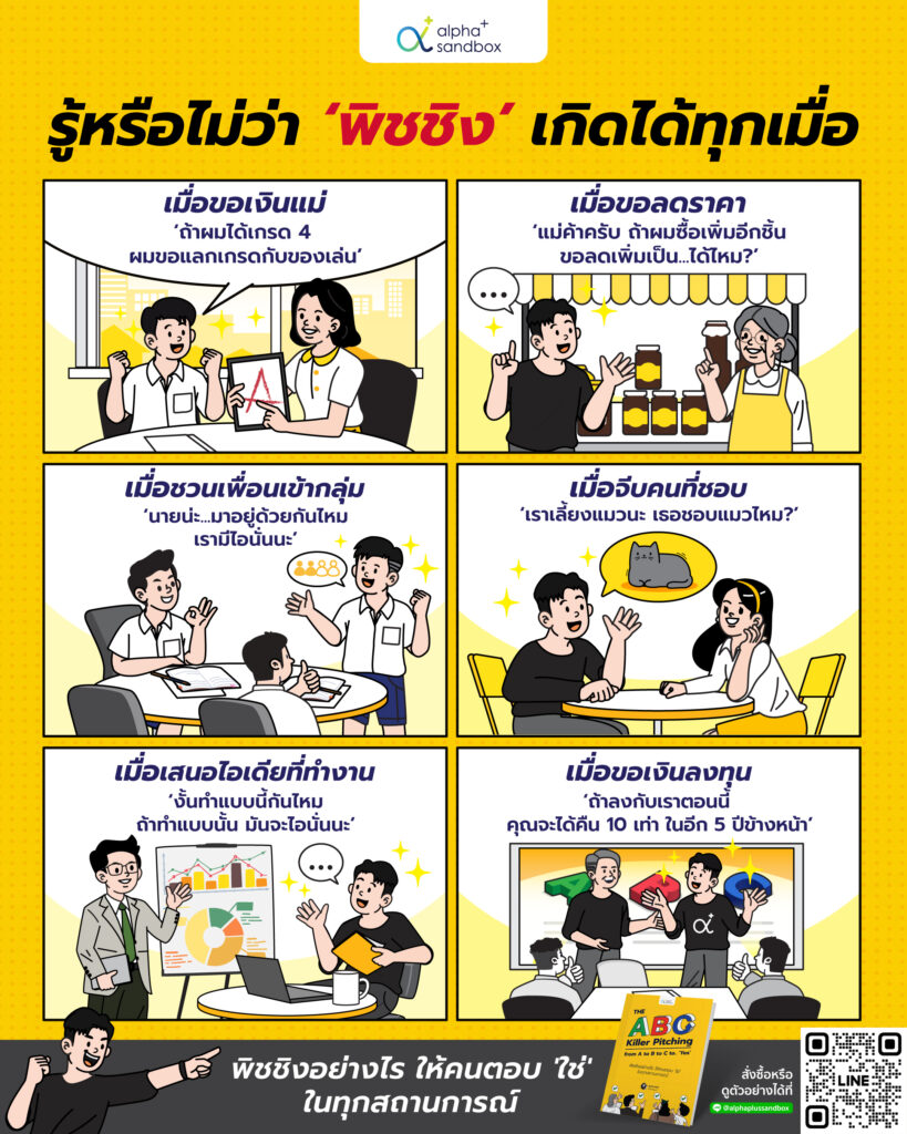 รู้หรือไม่ว่า นี่แหละคือการ ‘พิชชิง’ เพราะพิชชิงเกิดขึ้นได้ทุกเมื่อ ทุกสถานที่ และทุกเวลา แล้วพิชชิงแบบไหนที่เปลี่ยนคำตอบสุดท้ายให้เป็น ‘ใช่’ ได้ในทุกสถานการณ์ หาคำตอบได้ที่หนังสือ ABC Killer Pitching